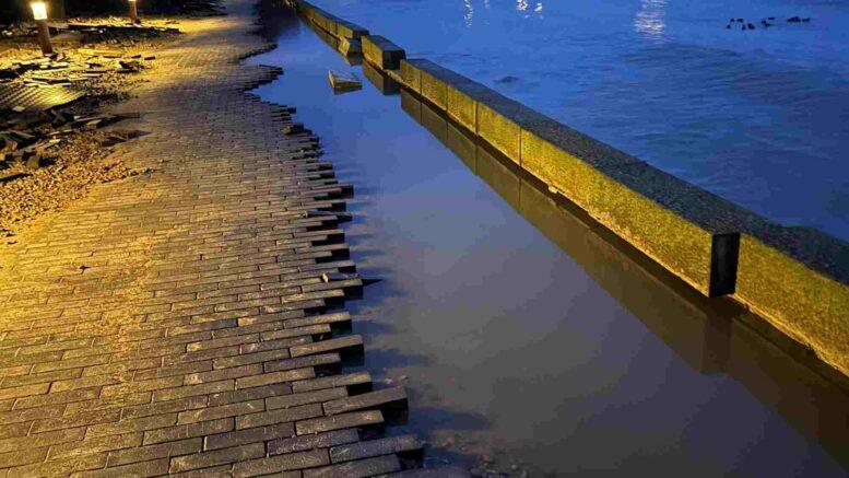 Skaderne på promenadens klinkebelægning opstår, når store mængder vand fra bølger slår ned på belægningen fra stor højde.