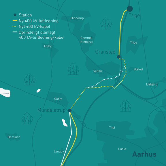 Illustration af to af i alt 20 større ændringer på linjeføringen af 400 kV og 150 kV forbindelser i Nyt elnet Aarhus-Aabenraa. Her er det ændring af kabel og luftledning vest for Aarhus. Find illustrationer vedhæftet og se interaktivt kort på projektets hjemmesiden www.energinet.dk/aarhus-aabenraa