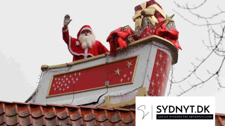 Det er byens egen julemand, der flyver henover taget ved Torvet i Tønder.