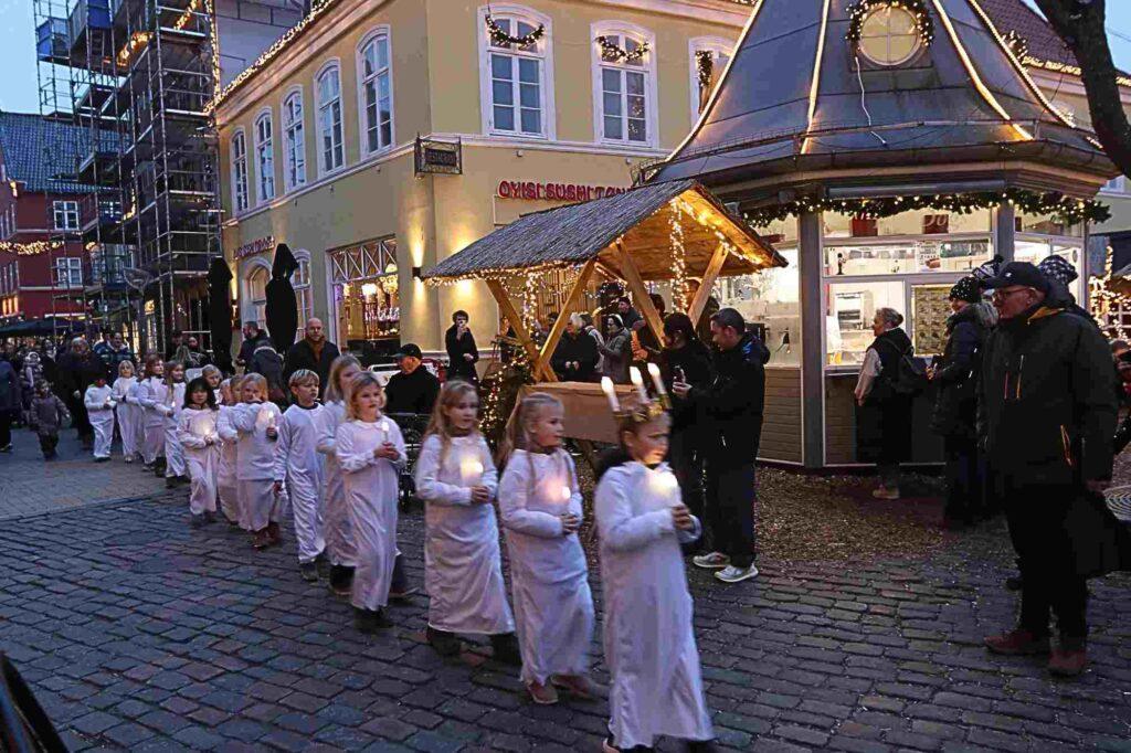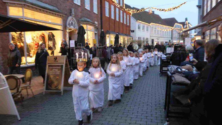Og et par minutter senere kom Marieskolens elever i det flotteste Lucia-optog fra Skibbroen gennem gågaden og op til Torvet.