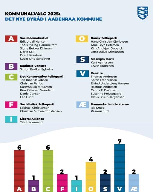 Optællingen af stemmer er afsluttet i Aabenraa Kommune her onsdag aften den 19. november 2025 og det kommende byråd ser ud som følger: