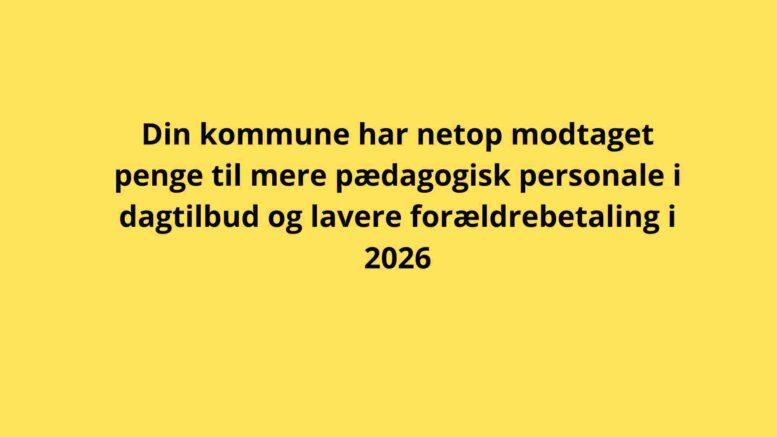 Kommunerne har nu modtaget første rate på i alt ca. 140 millioner kroner af de samlet set ca. 1,7 milliarder kroner, der skal sikre mere pædagogisk personale i dagtilbud og lavere forældrebetaling i 2026. Det sker som led i finanslovsaftalen for 2026 mellem regeringen og Det Konservative Folkeparti. Regeringen og KL er enige om, at kommunerne i videst muligt omfang skal sænke forældrebetalingen i løbet af 2026. Midlerne skal derudover anvendes til at ansætte mere pædagogisk personale. I 2026 vil kommunerne månedligt få udbetalt et tilsvarende beløb på samlet ca. 140 millioner kroner.