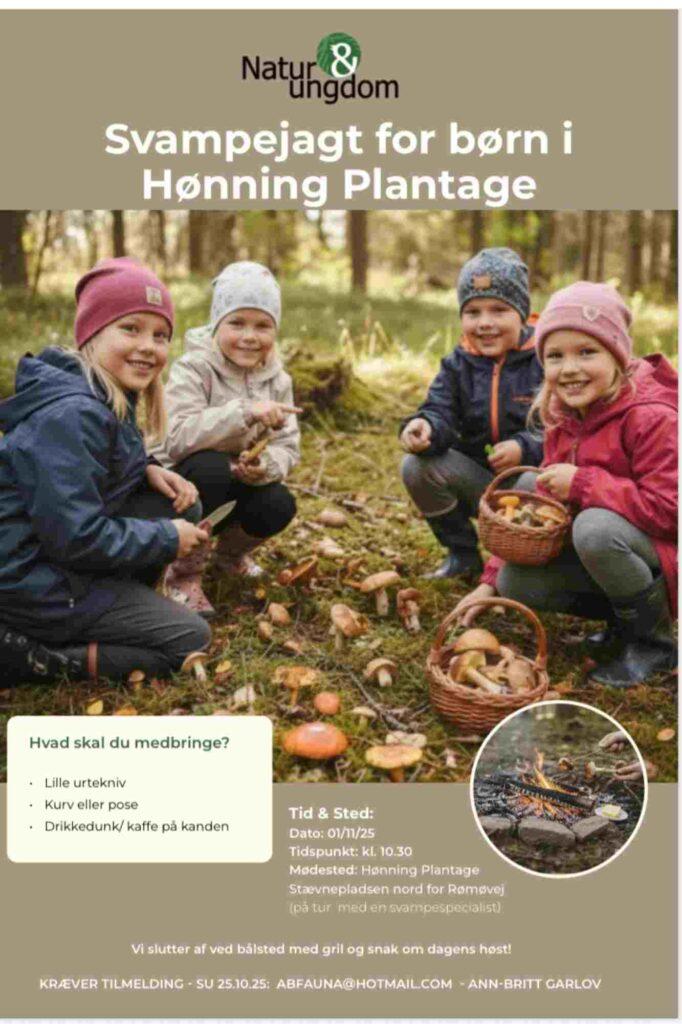 Natur & ungdom Tønder inviterer til Svampejagt for børn i Hønning Plantage – det sker lørdag den 1. november 2025 kl. 10.00 ude i Hønning Plantage – Stævnepladsen nord for Rømøvej