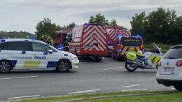 Brandvæsen, redning, ambulance og politi på vej til færdselsuheld i på rundkørslen på Ribevej/afkørsel 70b Sønderjyske Motorvej ved Rødekro. Giv plads for udrykningskøretøjerne og find…