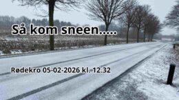 Klokken 12.32 startede det varslede snevejr i Rødekro i dag torsdag den 5. februar 2026. Den stærke blæst fra øst har aftaget en del lige…