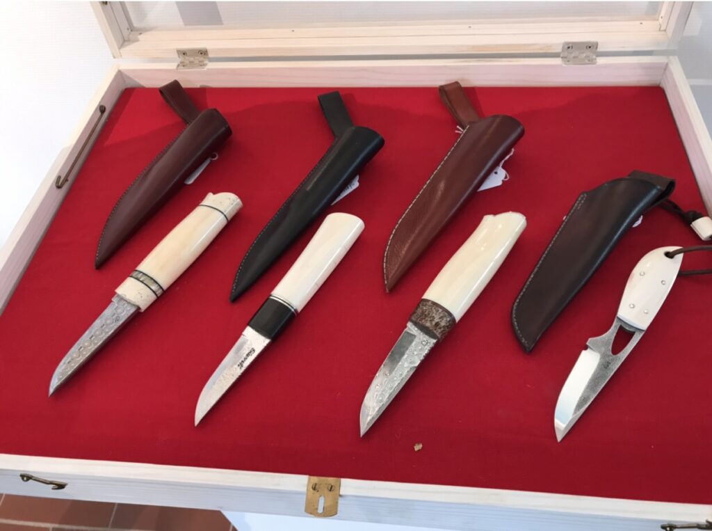 Han udstiller malerier samt sine eksklusive håndlavede knive.