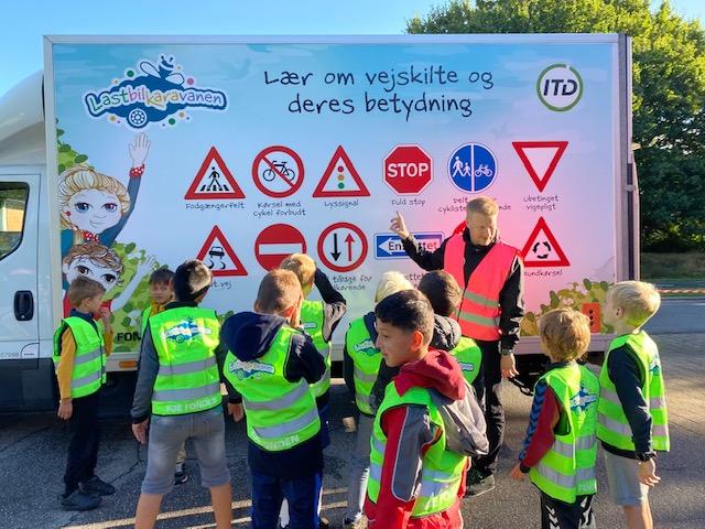 Lastbilkaravanen besøger elever i 0.-2. klasse på skoler i hele landet for at fortælle om varetransport og trafiksikkerhed.