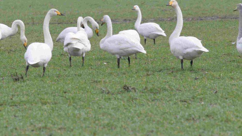 Det er svanerne, der samles på marken på venstre side for at finde føde.